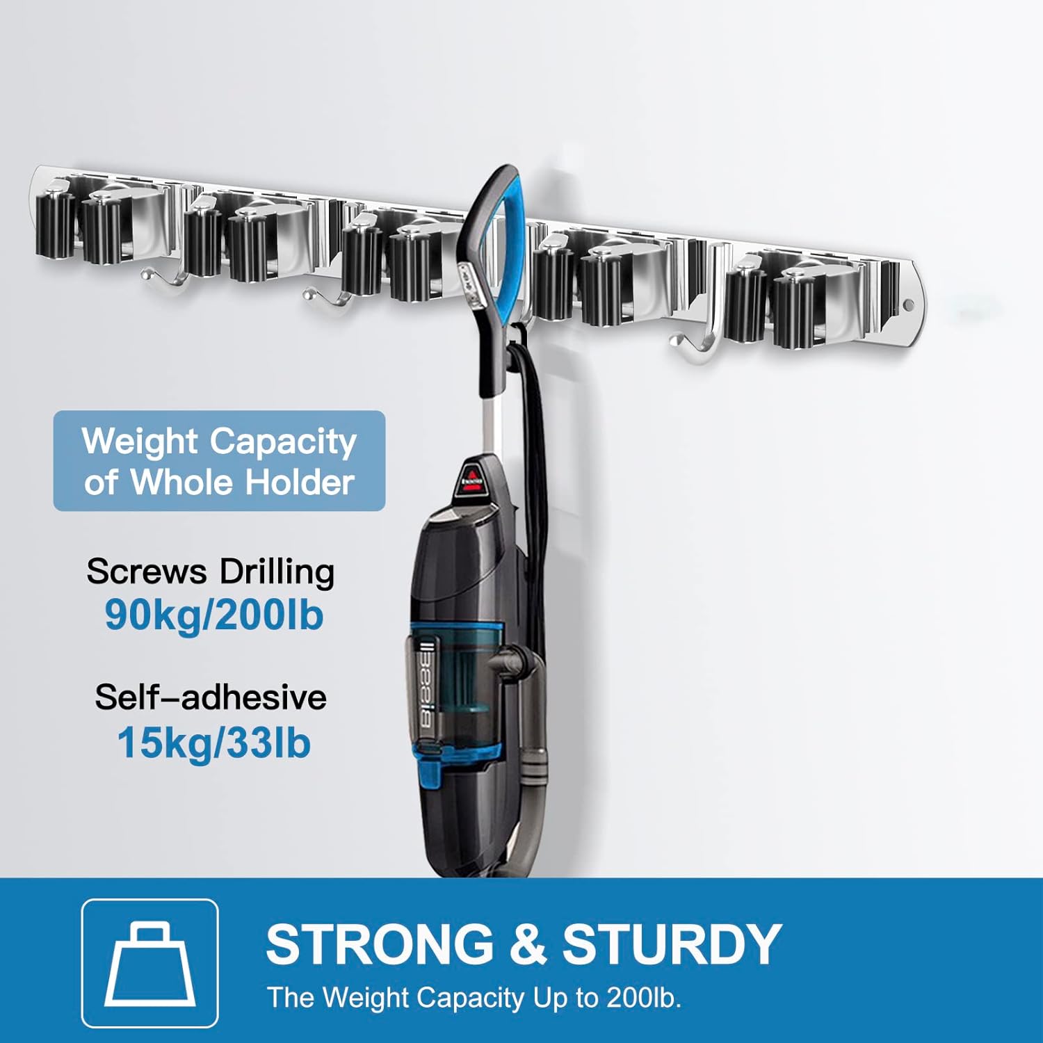 • Heavy Duty: Mop holder grip everything tightly and securely without slip. It can hold up to about 9 tools in total. Keep your place cleaned up and keep things organized