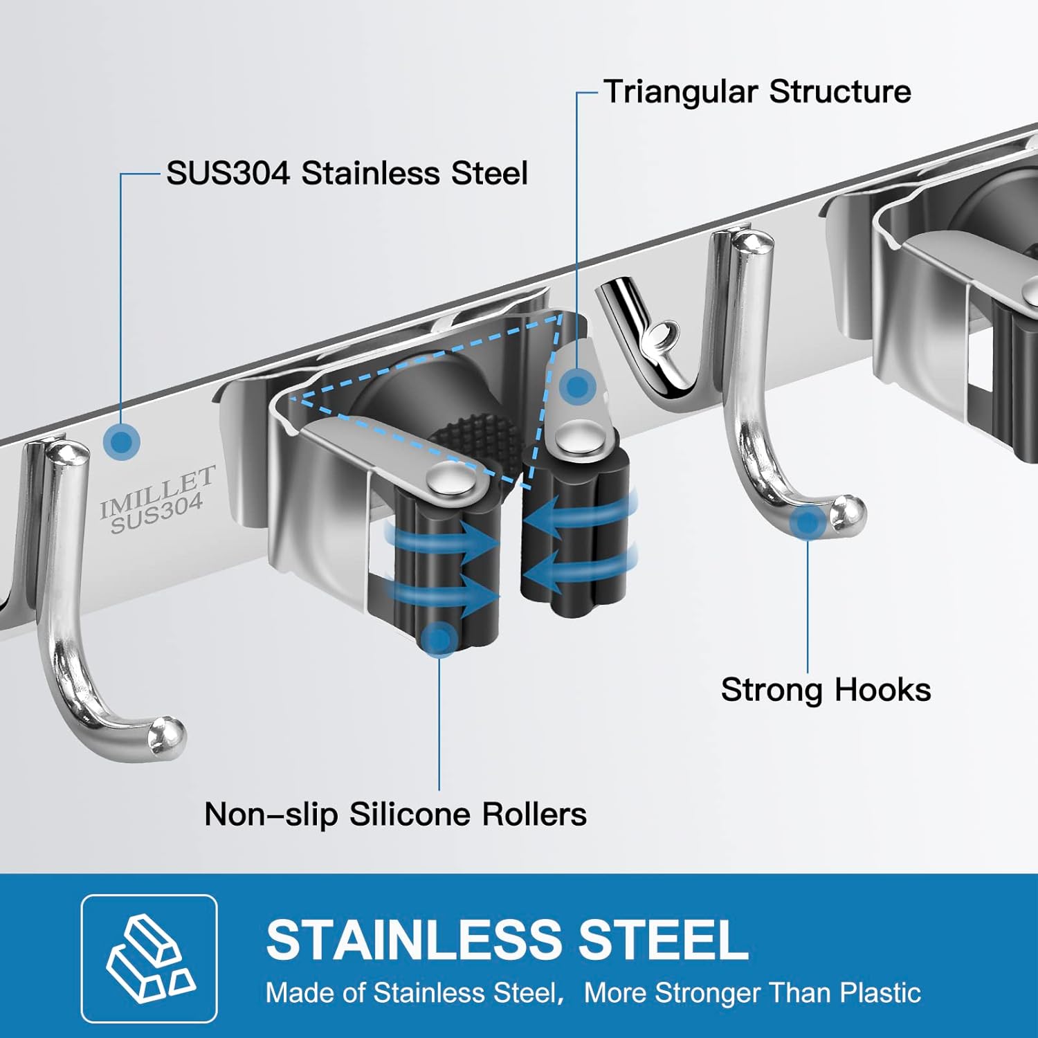• STRONG & STURDY: Broom organizer wall mount is made of 304 stainless steel, corrosion-resistant, moisture proof and waterproof. Compared with the plastic broom rack, it's more stronger and sturdy. And this garage organization can hold up to 200 pounds when install it by screws drilling,the hook also can hold your steam mop