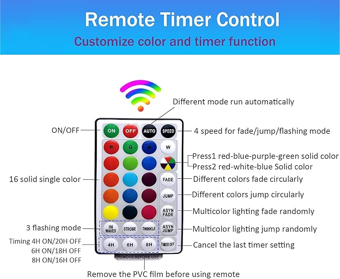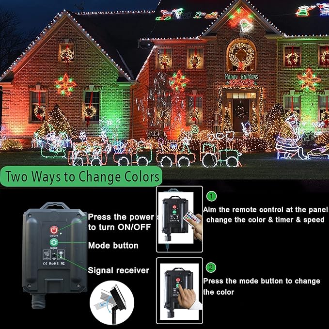• 7 Lighting Remote Control & Timer: Use the 32 keys remote controller for easily operation.7 lighting modes make the PVC tube fairy string lights fabulous:FADE, JUMP, ASYN FADE, ASYN JUMP, TWINKLE, STROBE, IN WAVES.This decorative solar rope string lights make your house and garden charming and romantic. Timer function : 4H/6H/8H. Freely control the solar Christmas lights, COLOR, MODE and TIMER are all in your control.