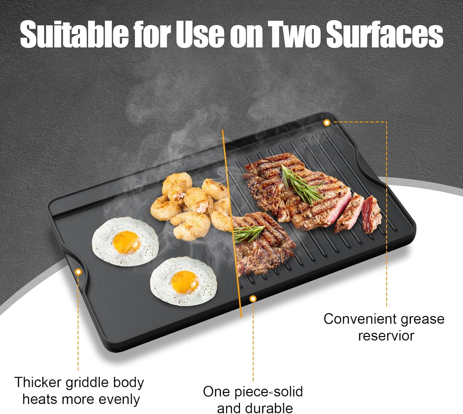 • Doublesided Grilddle - Reversible griddle plate made of premium quality and sturdy cast iron. On the smooth side, cook eggs, pancakes and bacon. On the ridged side, grill steaks, burgers, fish, chicken and veggies.