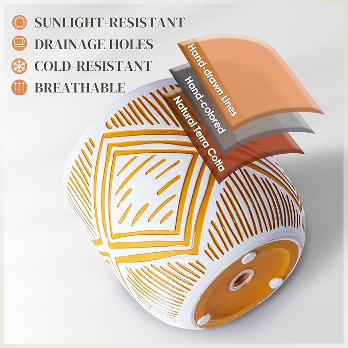 • Boho Style Flower Pots: The 2 modern bohe style ceramic flower pots have raised carved lines and bright yellow lines inside for a vibrant look.