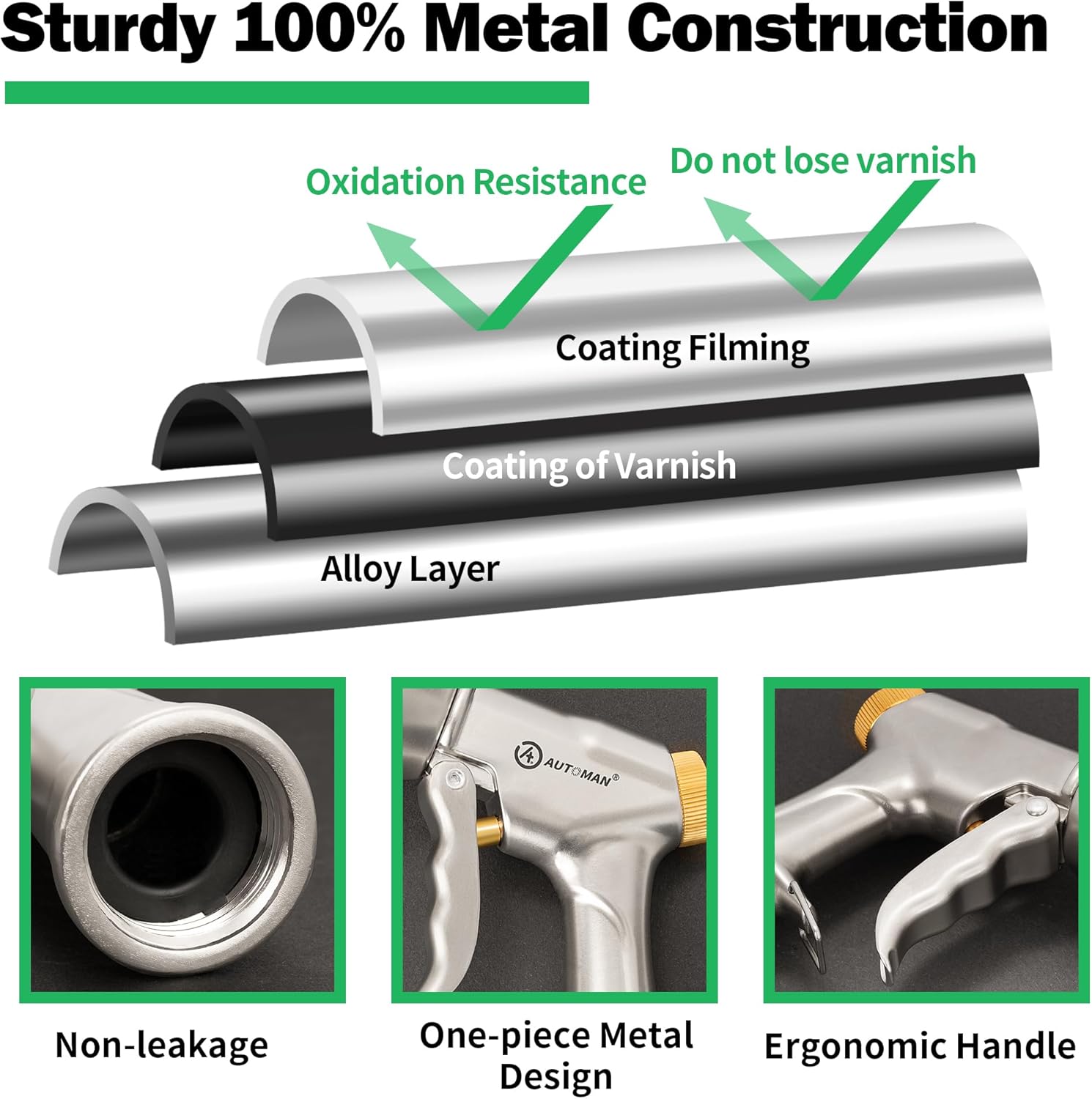 • 【100% Metal Construction】The AUTOMAN garden hose nozzle is built using heavy duty metal. It better stands up to impacts and resists corrosion. Our metal nozzles are also coated a coating film that makes the model exposed to rain and UV for several months without noticing any breaking, failing, or even rusting. Our garden nozzle is 100% metal and high quality to prevent leaks, rusts, and corrosions, much stronger and more sturdy than the plastic water nozzles.