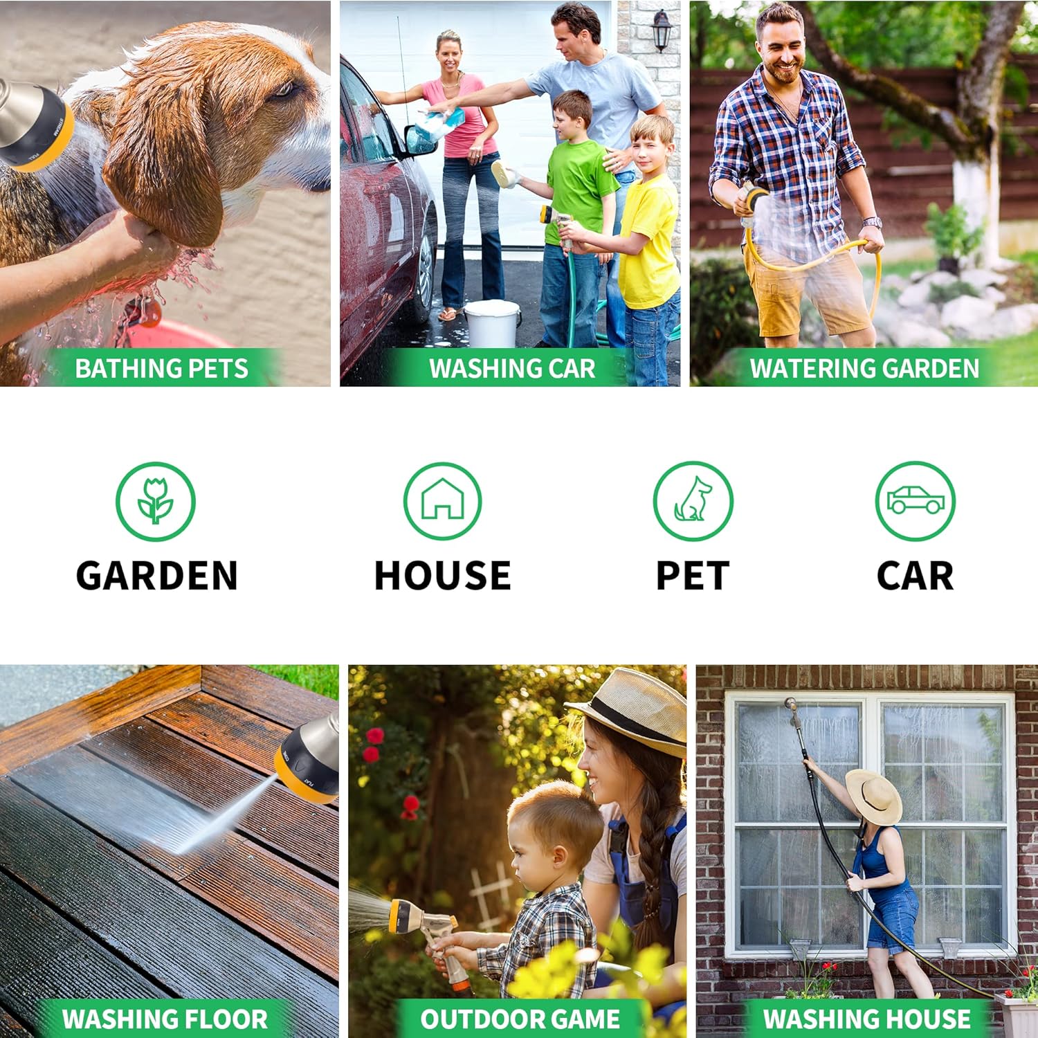 • 【Leak-Proof & High-Pressure Design】This water hose nozzle has a threaded connection and attached a rubberized gasket to prevent leaks and provide a sturdy tight seal. Fits all USA standard garden hoses - 3/4” Garden Hose Thread (GHT). Besides, extra 2 rubber gaskets included. The high-pressure water flow of our metal nozzle can go as far as up to 25 feet, making it ideal for watering your garden as well as washing your patio, garage, deck, yard, walkway, car and etc.