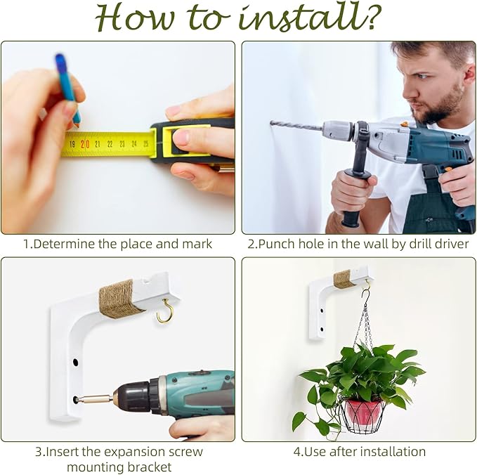• 【Easy to Install】Our plant hanger bracket hooks have two screw holes of each and includes mounting hardware for each hanger (4 mounting screws and 4 drywall anchors). You can follow these steps to complete installtion within miniutes : find the place where you want to install, mark the hole, drill the screw hole as you makred, insert the drywall anchors then install the hanger hooks and complete.