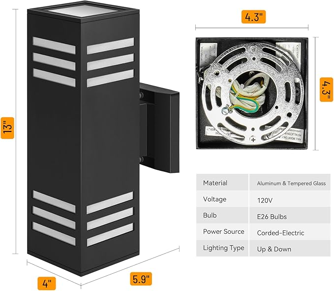• Outdoor Home Decor: E26 Bulbs included, square shape up and down outdoor wall sconce each face with 3 frosted light transmission barras creates a comfortable and warm lighting effect adding stylish modern atmosphere to your home makes everything different.