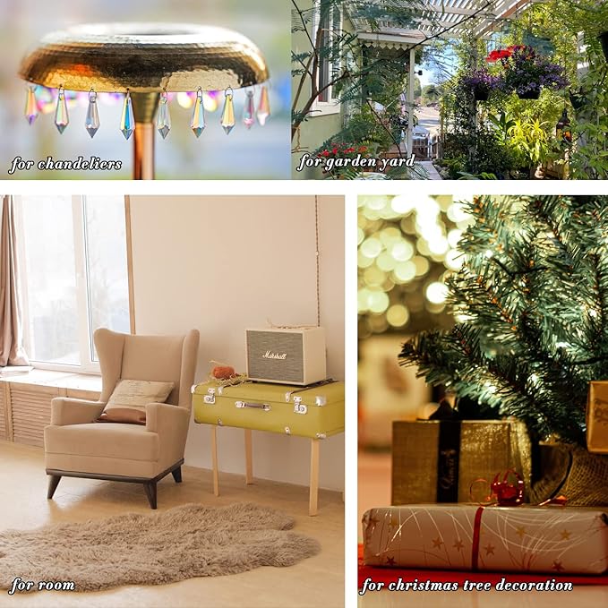 • MULTI FUNCTION-- Nice for Home Office Garden Window, Feng Shui Crystals, Chandelier Crystal Parts, Wedding Decoration, Christmas Tree Decor or any crystal projects. Good for sun catcher as a house, garden and car, It's also fun to turn these to enhance a new light fixture very pretty on your christmas tree, party decoration, DIY chandelier and more, get an amazing light and color show