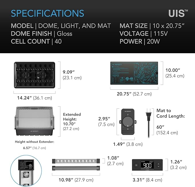• Durable drip and plant trays with optional height extension panels support up to 40 seedlings and clones.