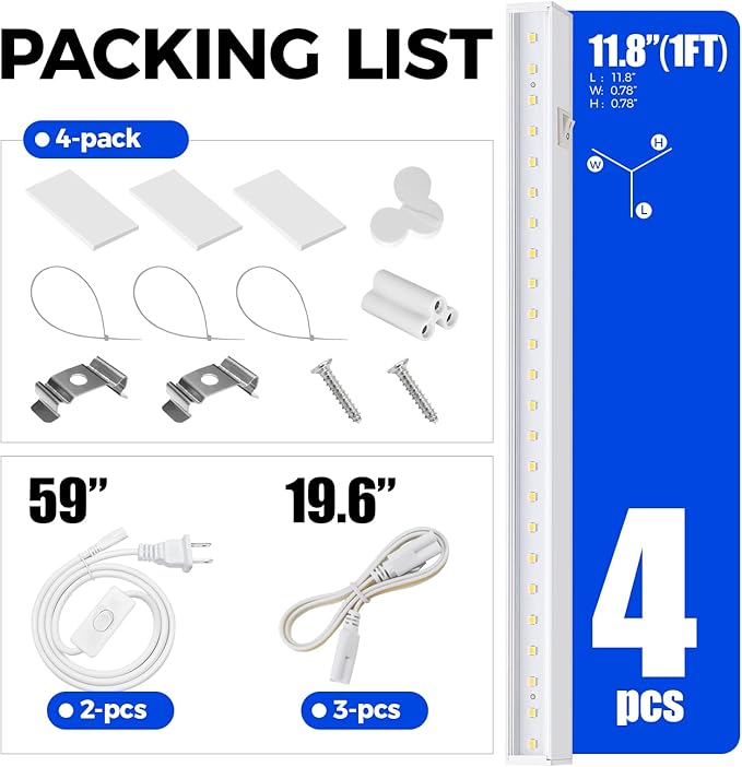 • What You Get: 4 x Barrina T5 Grow Lights, 2 x Power Cords with ON/OFF Switch, 4 x Connecting Cords(20''), 4 x Small Connectors, 8 x Installation Clips, 12 x Double-sided Tapes, 12 x Cable Ties
