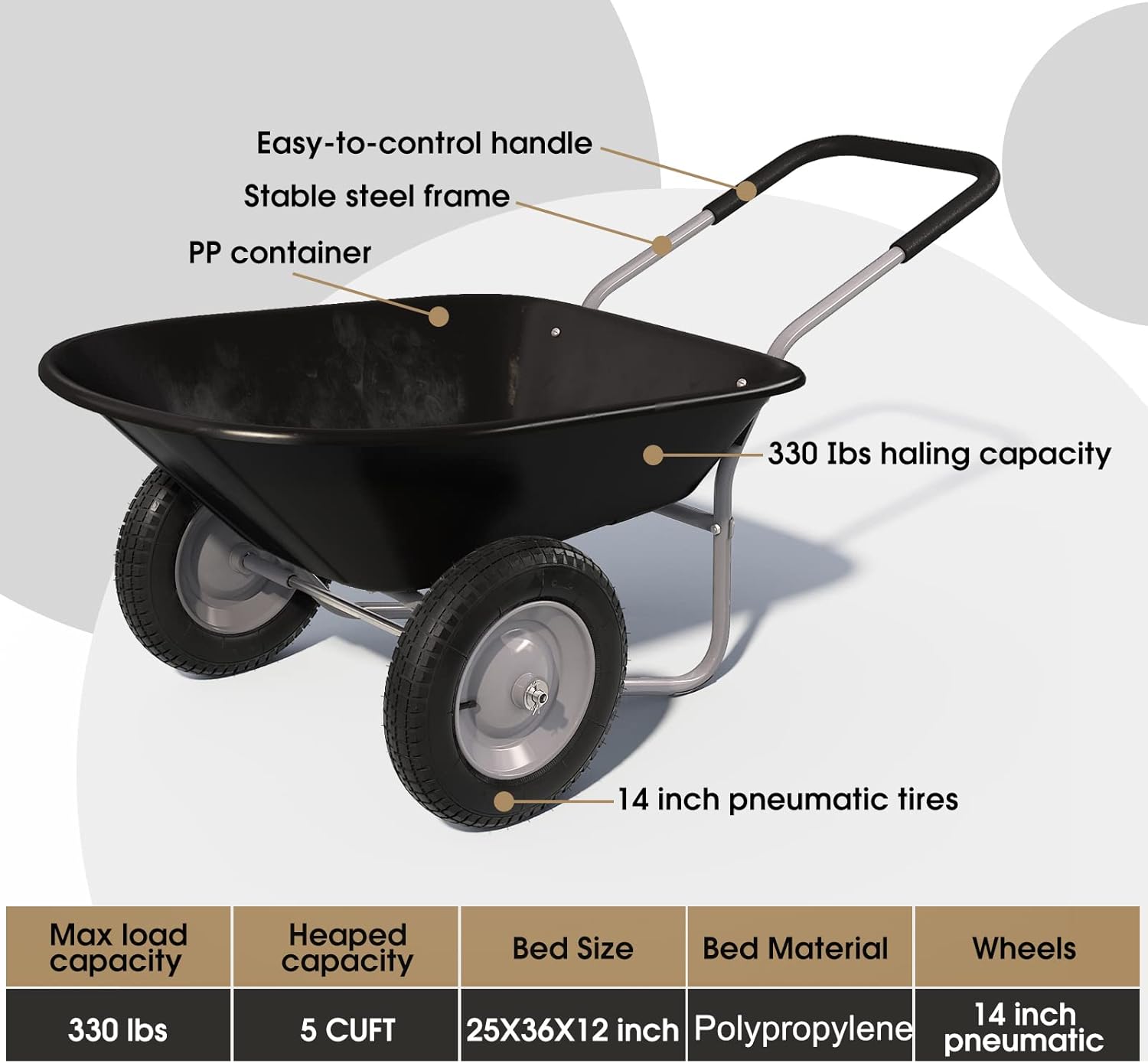 • βœ…Stability - The dual-wheel design of this wheelbarrow is better suited for lifting heavier loads, and the two wheels ensure more stability. 330LBS weighing capacity is perfect for the home gardener or professional landscaper.