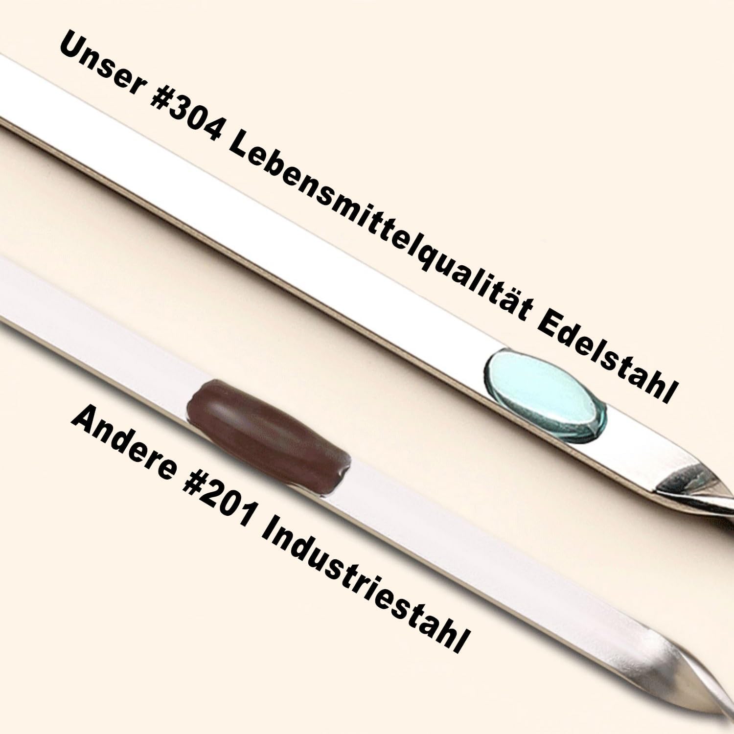 • 【304 barbecue skewers have weak magnetism】304 stainless steel is non magnetic or weakly magnetic. 304 stainless steel may have weak magnetism because during the processing and forging process of the product, a small amount of austenite is converted into martensite, so 304 stainless steel may have a little magnetism. Our barbecue skewers may have a slight magnetism due to the processing of the tip and handle, which is a normal phenomenon.