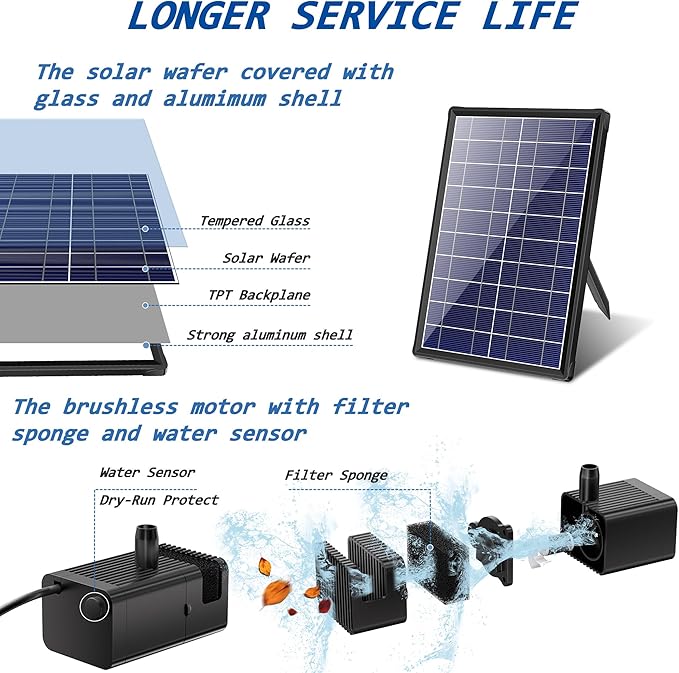 • MORE POWERFUL SOLAR FOUNTAIN KIT: Our solar panels are covered with glass, which can protect the solar wafers well and does not affect the conversion efficiency of solar energy. These solar panels have a power of 7.5W and output a voltage of 10V to make the pump work more stable and powerful.