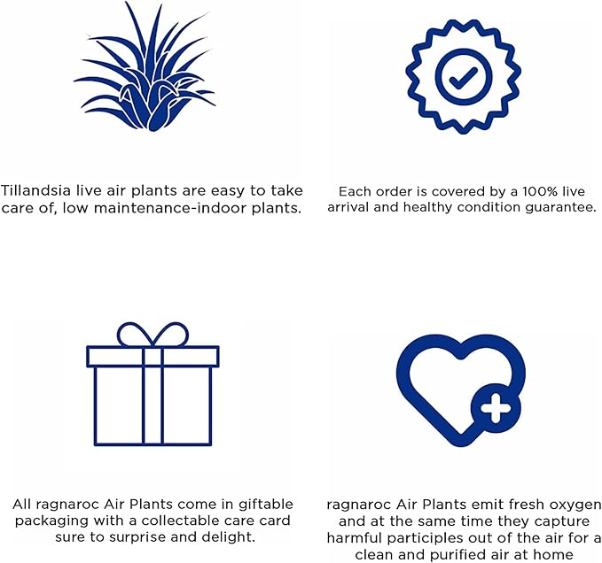 • HEALTHY PLANT ARRIVAL ASSURANCE: ragnaroc is committed to delivering vibrant and thriving air plants to your doorstep. Our live air plants are packed directly from Florida, and every order comes with a promise of their safe and healthy arrival. If, for any reason, you find yourself less than satisfied with our plants, please inform us, and we will promptly arrange a full refund or send you replacement plants.