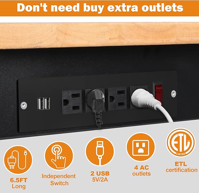 • 【4 AC 2 USB Power Outlets】 The ETL certified power strip has 4 AC Outlets, 2 USB Ports and 1 Switch, with 6.5 ft long Wire, which is safe and durable, making it easy to equip the worktable with various electric tools and lights