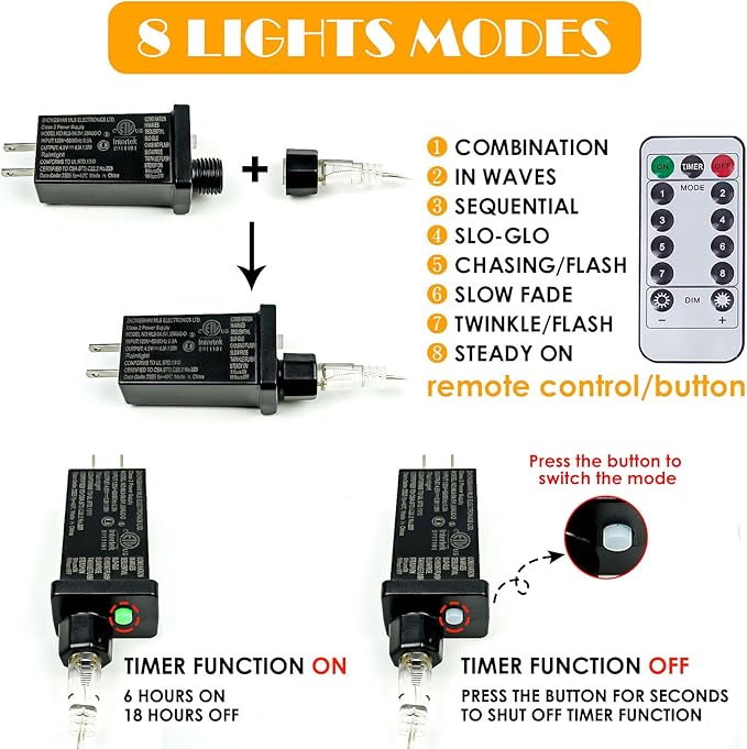 • Remote & Timer Function & 8 Modes & Memory Function: The remote string lights included a remote control for more convenient. Use the remote to change multiple modes: turn the lights on/off, choose from 8 lighting modes (combination, in wave, sequential, slo glo, chasing/flash, slow fade, twinkle/flash, steady on), set the timer (6 hours ON, 18 hours OFF) and adjust the brightness (10 brightness levels). This fairy lights could remember the setting of previous night you set.