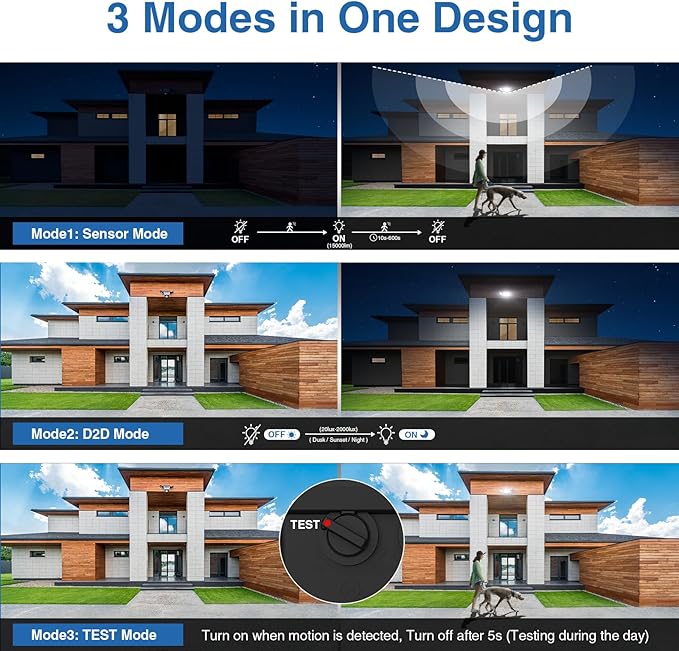 • 【3 Lighting Modes】Mode1: Sensor Mode, turns on when motion is detected. Mode2: D2D (Dusk to Dawn) Mode, automatic turn on at night, automatic light off during the day. Mode3: TEST Mode, turn on when motion is detected, Turn off after 5s.