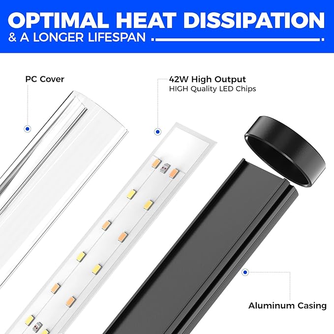 • High-output and Effective Spectrum: The full spectrum grow light with a high output of 42 watts and up to 169 LEDs. Moreover, it is equipped with 660nm red wavelength chips to satisfy your plants' needs at different stages.With a CRI of 88, this grow light accurately shows colors, aiding in plant health monitoring and growth