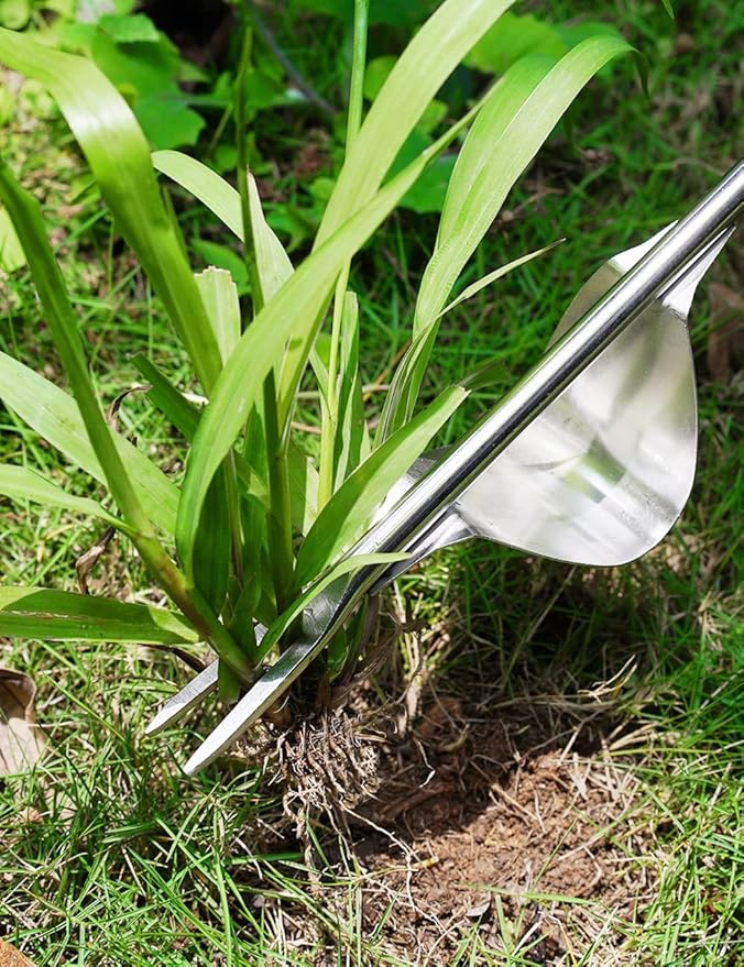 • L-shape and Fork-shape Design: The edges of the weed removal tool use the L-shape and fork-shape design to scrape stubborn grass off quickly. They are sharp so be careful to use them.
