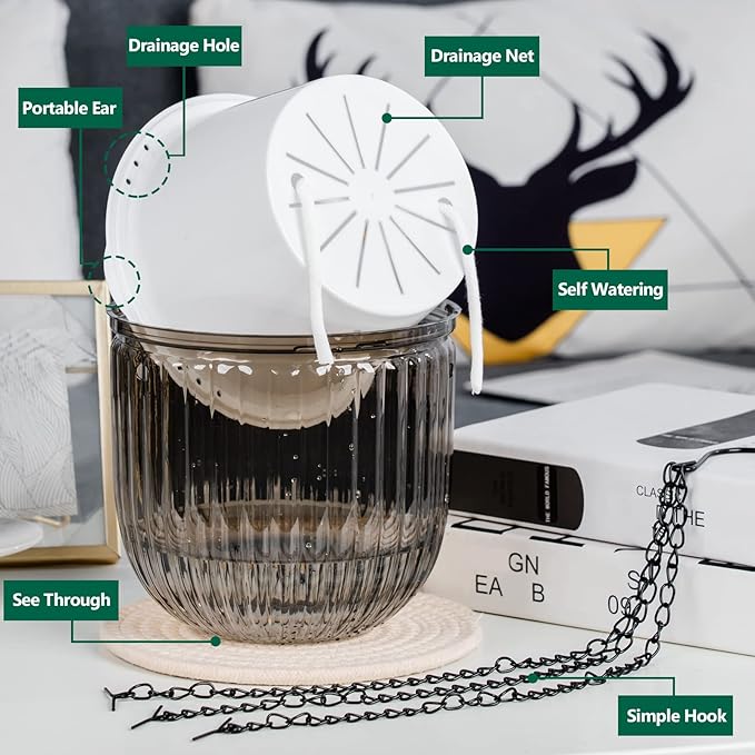 • Hanging Self-Watering System: Includes chains and wicks to transfer water from the outer pot to the inner pot for consistent moisture.
