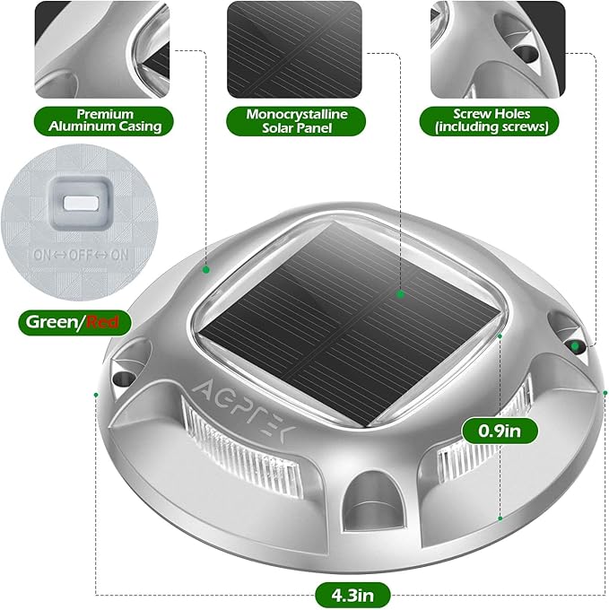 • 【IP68 WATERPROOF SOLAR LED DECK LIGHTS】With an IP68 waterproof design and a tightly sealed battery compartment, these solar driveway reflectors lights can resist any terrible weather, like a rainstorm, or daily heat.