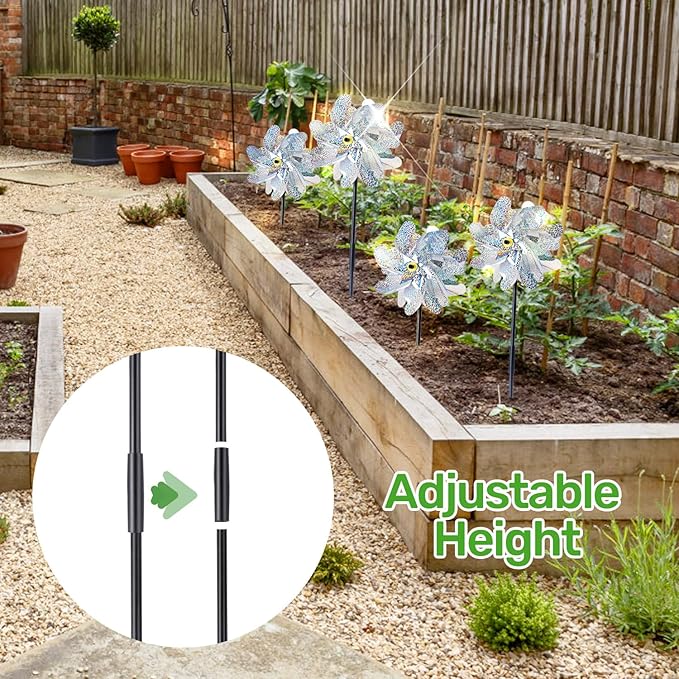 • Size & Adjustable Height : The reflective pinwheel dimension is 7” H*3.9” W, 10 packs per set. The total height of the 2 stakes is 15.7 inches. But it contacts with 2 sections so you could adjust the height as needed