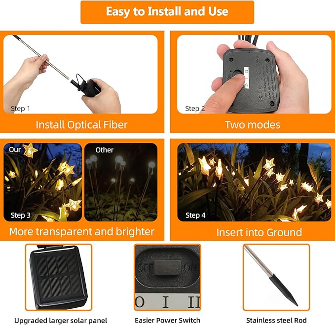 • ✅【Sway When the Wind Blows】: Our upgraded solar garden lights pole is supported by softer and flexible wires, when the breeze blows, it will sway with the wind, providing any swing angle you want, just like a group of cute fireflies dancing in your garden, carrying shining stars, like magic appearing in the garden, solar firefly lights are designed to create a romantic atmosphere for your garden! This outdoor solar lights for yard will be the most beautiful decoration in your garden!