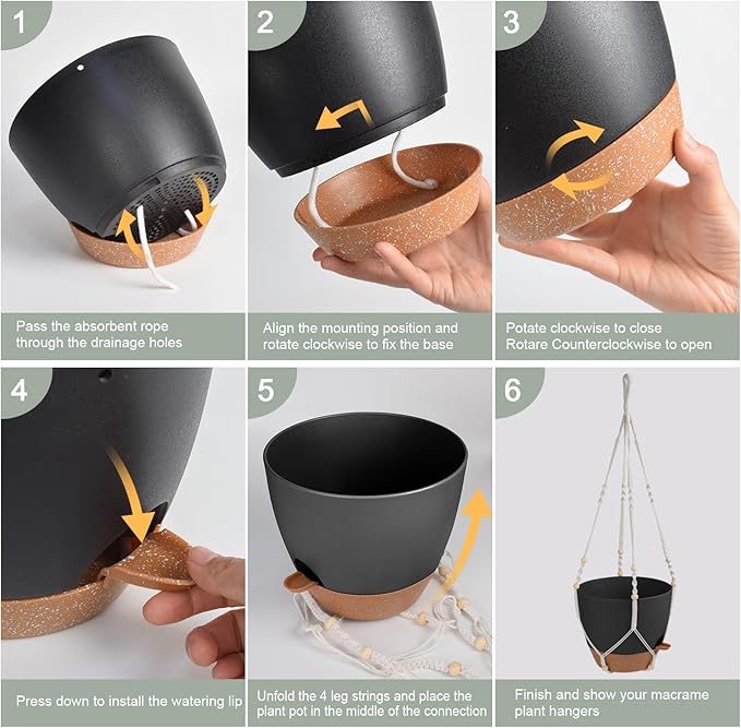 • Self Watering Pots - The self watering hanging planter features multiple drainage holes to help you avoid over-watering and release excess water. Separate the potting soil from the water surface, enter the water through cotton rope perforations to keep the soil moist and the plants healthy growth.