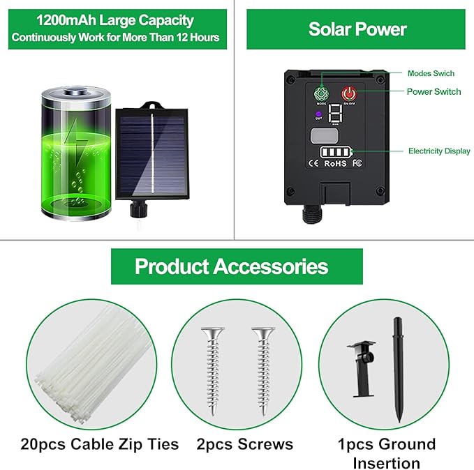 • 【High Battery Capacity & Safe】The solar string lights with 300pcs low-heat-emission LED bulbs, up to 19% high energy conversion rate comparing to others’ 13%. The solar fairy lights can work continuously for more than 12 hours at night if the panel absorbs enough sunshine during day. Meanwhile the fairy string lights is environmental friendly and energy efficient. The lights will not overheat after using many hours, so they are durable and safe to use.