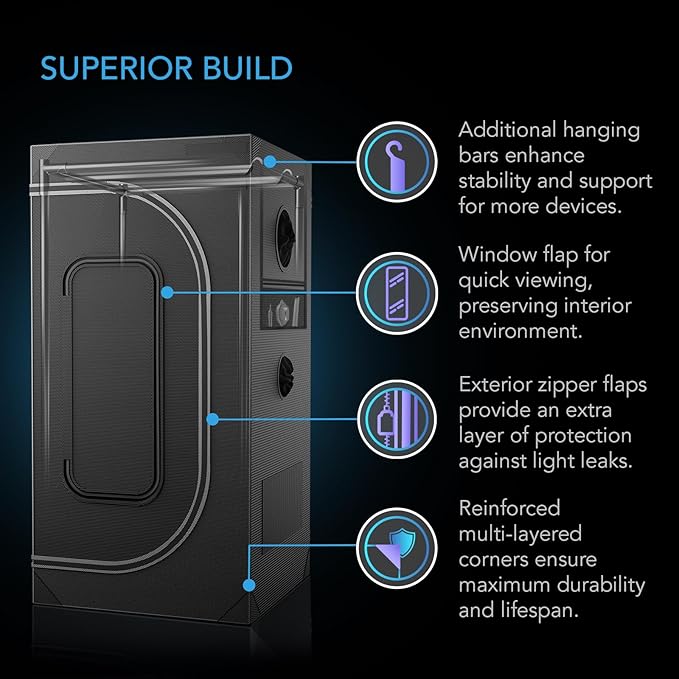 • Advance grow tent features lab-tested reflective Mylar for maximum light efficiency, taller window for clear visibility, and enhanced light-blocking design.