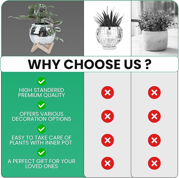 • TURN ANY SPACE INTO A DAZZLING OASIS WITH OUR DISCO BALL PLANTER. Elevate your décor and create a magical atmosphere with this one-of-a-kind disco ball planter. It's not just a pot; it's a conversation starter and a work of art. Whether in your living room, bedroom, or office, it's sure to turn heads and spark joy.
