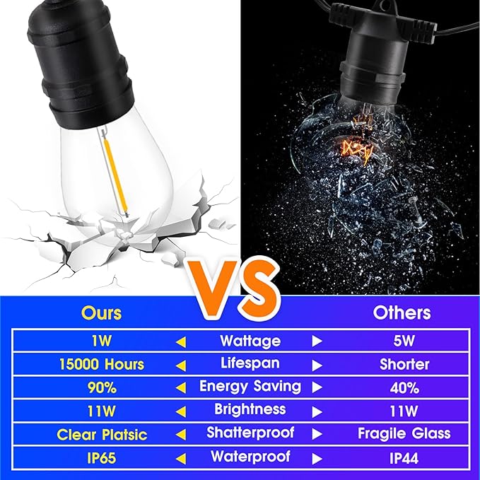 • 【Weatherproof&Shatterproof】Edison light string can create a romantic atmosphere for you, which can bear sun, wind, rain, snow or other extreme temperature during outdoor using. S14 plastic bulbs are shatterproof and durable