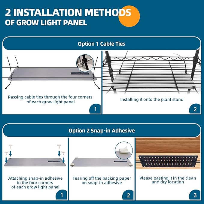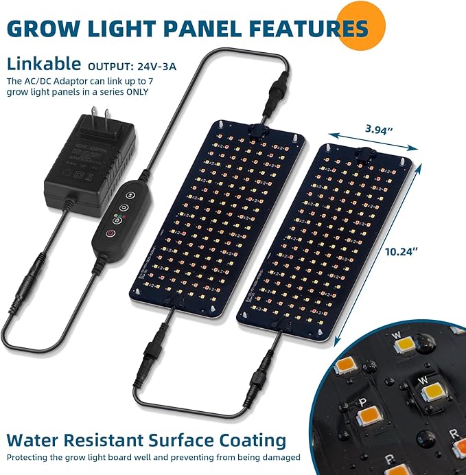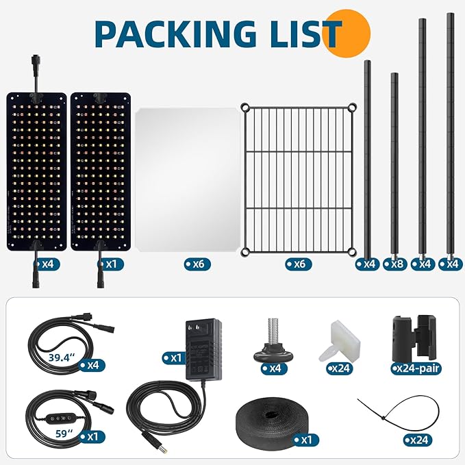 • What You Get: 5 x Barrina Grow Light Panel, 1 x AC/DC Adaptor, 1 x Power Cord with Turn On/Off Timer, 4 x Connecting Cord, 1 x Hook and Loop Tape, 24 x Snap-in Adhesive, 24 x Cable Tie, 6 x wire shelf, 6 x PP pad, 1 x Accessory Kit for Plant Shelf, 1 x Installation Manual