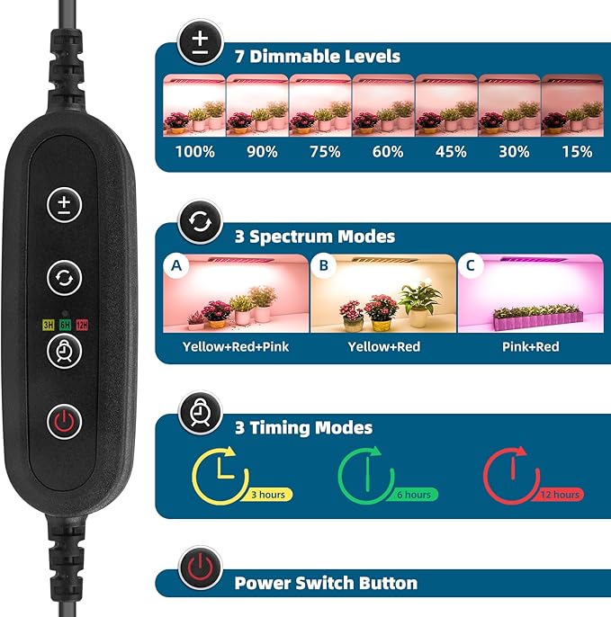 • Multiple Functions: Our plant growing lamp has 3 spectrum modes, 7 dimmable options (100%-90%-75%-60%-45%-30%-15%) and 3 cycle timing settings(3H/6H/12H), suitable for every cycle of plant growth, saving electricity while also ensuring the light needs of plant growth. And will take good care of your plants while you are at work or on vacation, easy and convenient