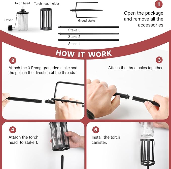 • 【Easy to Assemble】No tools needed, just screw all the parts together as the instruction. Upgraded 3-prong stakes make the torches more stable.