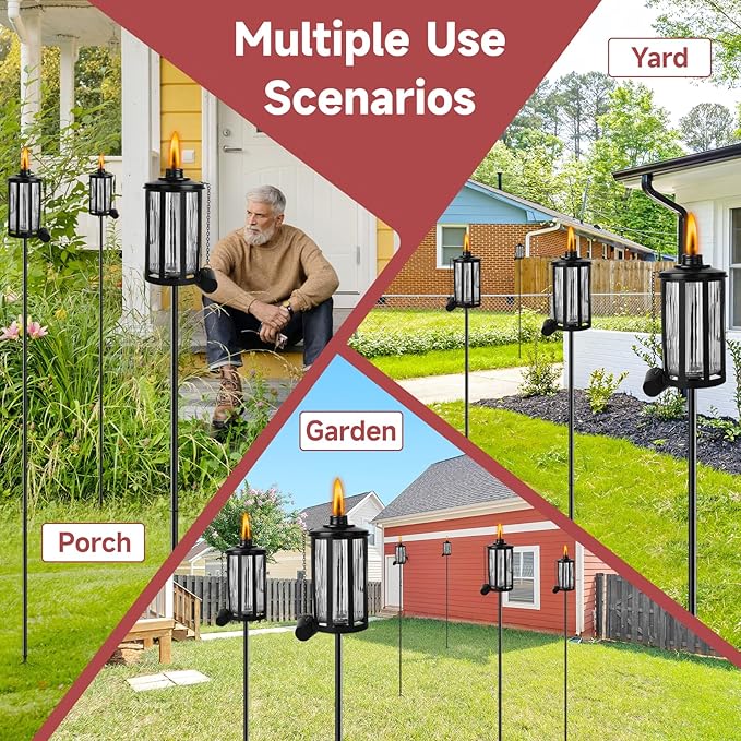 • 【Premium Material】These metal torches are made of high-quality metal & clear glass, rust-proof, durable, and lightweight. Came with long-lasting fiberglass wick & metal snuffer.