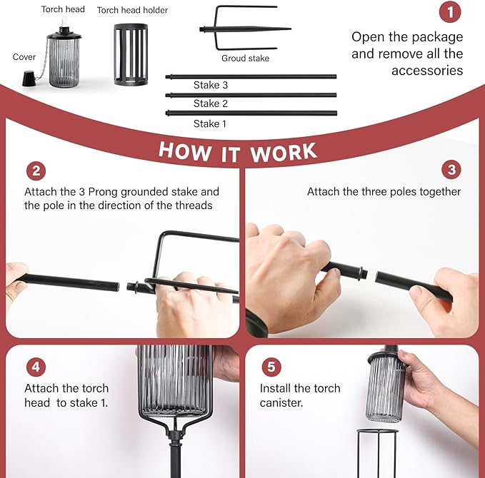 • 【Easy to Assemble】No tools needed, just screw all the parts together as the instruction. Upgraded 3-prong stakes make the torches more stable.
