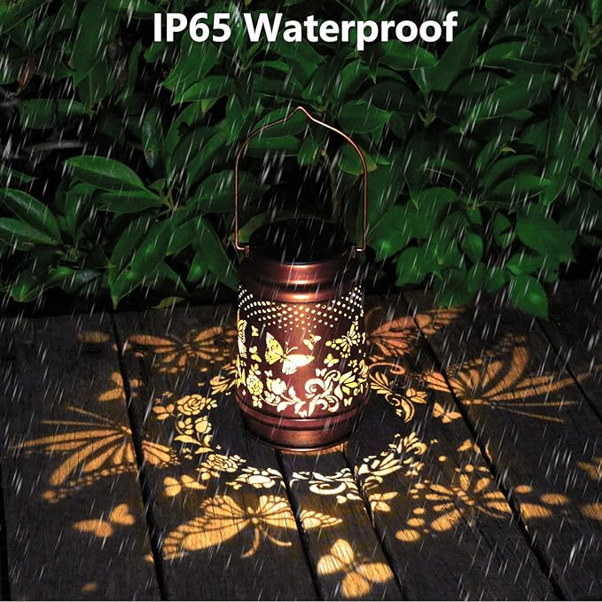 • Graceful Decorative Design - The retro appearance, with gold copper color and hollow out metal veneer, the solar outdoor lanterns casts bright and warm light in darkness, accompanied by gorgeous and graceful butterfly patterns, adding a beautiful atmosphere to the surrounding environment.