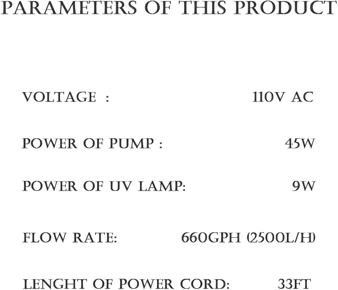 • U*V bulb- The built-in UV bulb works wonders by transforming green water into crystal-clear water. This feature ensures a healthier environment for your pond's ecosystem, making it a safe haven for aquatic life.A convenient indicator on the top lets you know if the light is functioning.