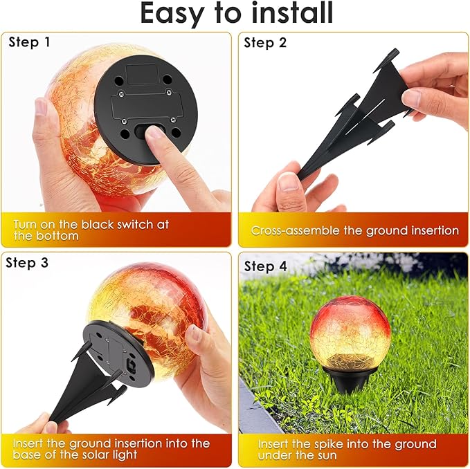 - IP65 Waterproof and Durably:Solar lawn lights decorative are fully enclosed by ABS and cracked glass. Durably construction and weather resistant feature of the solar ball lights outdoor. Our garden lights solar powered are made of IP65 waterproof upgrade and there will be no condensation, can be used in bad weather conditions such as rain, snow, ice, wind and so on