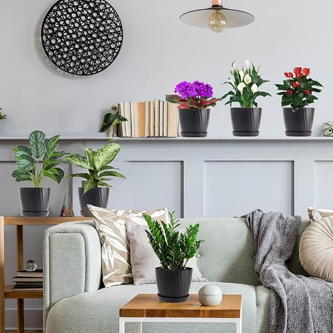 7 Inch Plant Pots Bulk, 6 Pack Plastic Planters with Drainage Holes and Saucers for Indoor Outdoor House Plants and Flowers, Black
