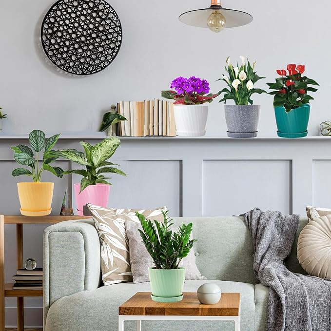7 Inch Plant Pots Bulk, 6 Pack Plastic Planters with Drainage Holes and Saucers for Indoor Outdoor House Plants and Flowers, Colorful