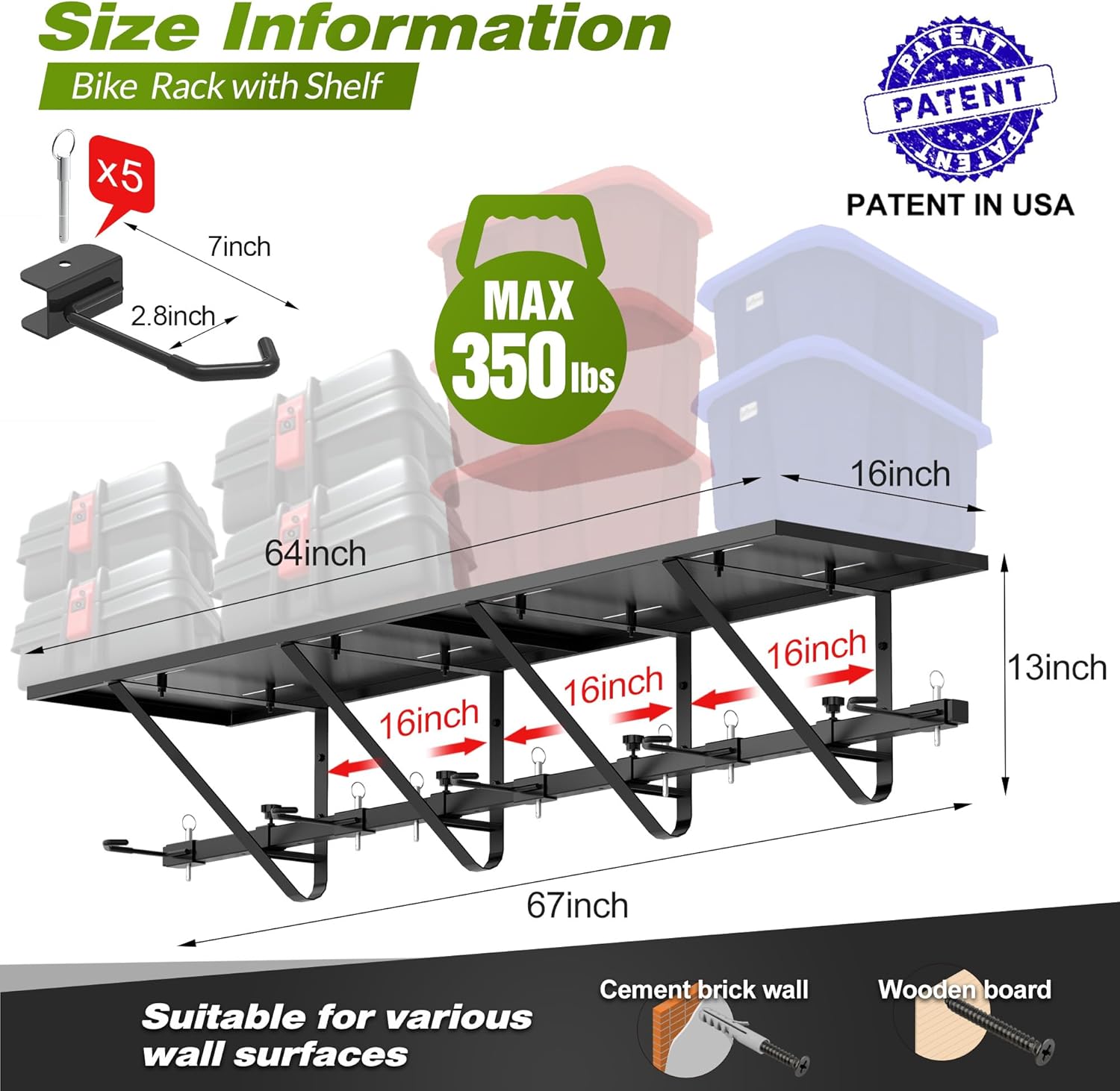 • High Capacity: 68" elongated bike rack with a 64x15inch large space size shelf provides high-capacity storage. It holds up to 300lbs on the rails and 100lbs on the shelf, maximizing space and organizing your garage effectively. The 16" hook spacing perfectly fits 5 bikes. Equipped with hexagonal high-strength self-tapping sand matching ribbed plastic anchor to ensure that both wooden walls and brick walls can be installed. The bike storage can thus free up crucial space in your garage or home.