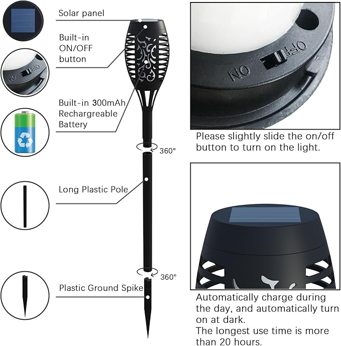 • 🔥【Auto Charge & Auto Light Up】: Solar tiki torches for outside automatically collect solar energy all day in direct sunlight and turn it into electricity to continuously charge the battery and include a photosensitive control switch on its solar panel, From dusk to dawn (no sunlight), the lights are automatically turned on, and when the sun rises (the solar panel receives sunlight) the lights will automatically turn off and charge automatically. Convenient and practical.