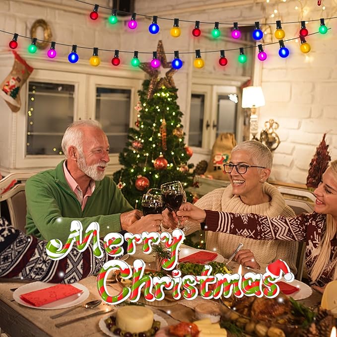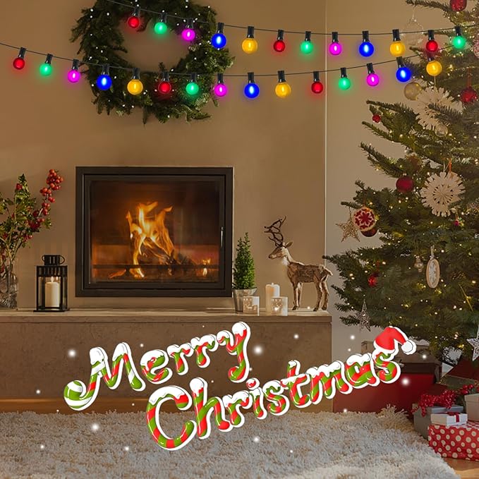 • ✨Safety and Energy Efficient: 50Ft G40 LED Christmas string lights Outdoor with 27 led shatterproof frosted multicolor bulbs (2 Spare), C7 or E12 Candelabra base, each G40 frosted multicolor led bulb 0.6W, outdoor led christmas multicolor patio string lights is more than 90% energy efficient than vintage edison globe string lights. G40 frosted colorful bulbs string lights emit a mesmerizing, multicolor brilliance, creating a captivating and festive atmosphere.