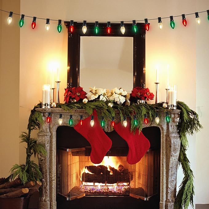 • Led Multicolor Christmas lights: C7 Led multicolor Christmas lights string outdoor with red/green/frosted white bulbs glow naturally warm, creating a vintage effect or antique atmosphere and romantic atmosphere. C7 led Red Green/White Christmas lights Perfect for wedding, birthday, Valentine's Day decoration and lighting.