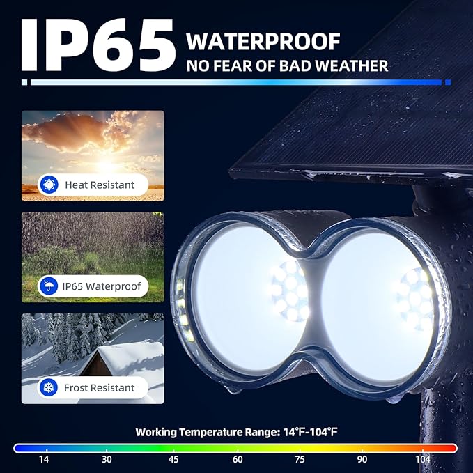 • IP65 Waterproof and Auto On/Off: These solar lights for outside turn on automatically at night and turn off at dawn. Resistant to snow and heat, they are functional in temperatures ranging from -20°F to 122°F. The IP65 waterproof rating ensures superior lighting and extended durability