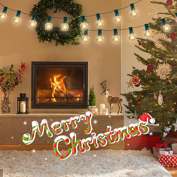 • Outdoor String Lights: 25 Feet Christmas outdoor string lights with 27 G40 clear incandescent bulbs(2 spare), globe light bulbs are 2.36" tall by 1.57" wide, G40 Outdoor string lights have E12 candelabra socket base for Indoor home Outdoor patio decor.
