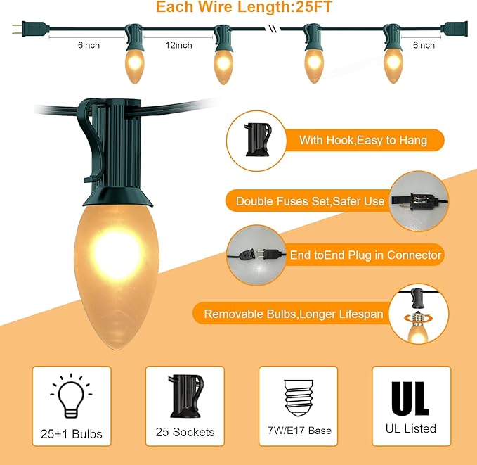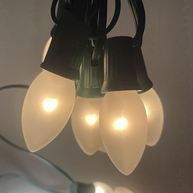 • Vintage Frosted Christmas Lights: Frosted Christmas Lights feature incandescent lamps in a stunning Frosted White color, adding a touch of elegance to any setting. The classic E17/C9 candelabra socket base ensures a secure fit, and with 25 bulbs plus 1 replacement bulb, you can enjoy continuous enchanting glow.