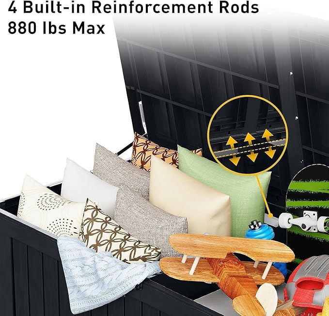 • ROBUST AND RELIABLE DESIGN - Engineered for heavy-duty use, this deck box can support up to 900 lbs, thanks to its reinforced metal rods and internal supports. Its thicker (0.08'') panels and precise assembly ensure superior stability and prevent warping or deformation over time.