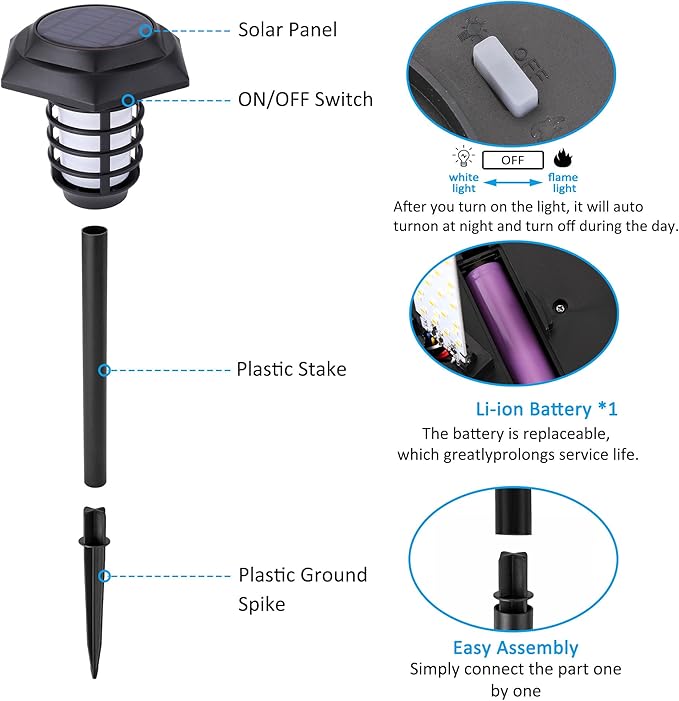 • 【Durable Solar Path Lights】Made of quality metal material, with rust resistant black coated finish, the stakes and poles are made of upgraded thicken ABS plastic, this solar flame light is durable for outdoor use.