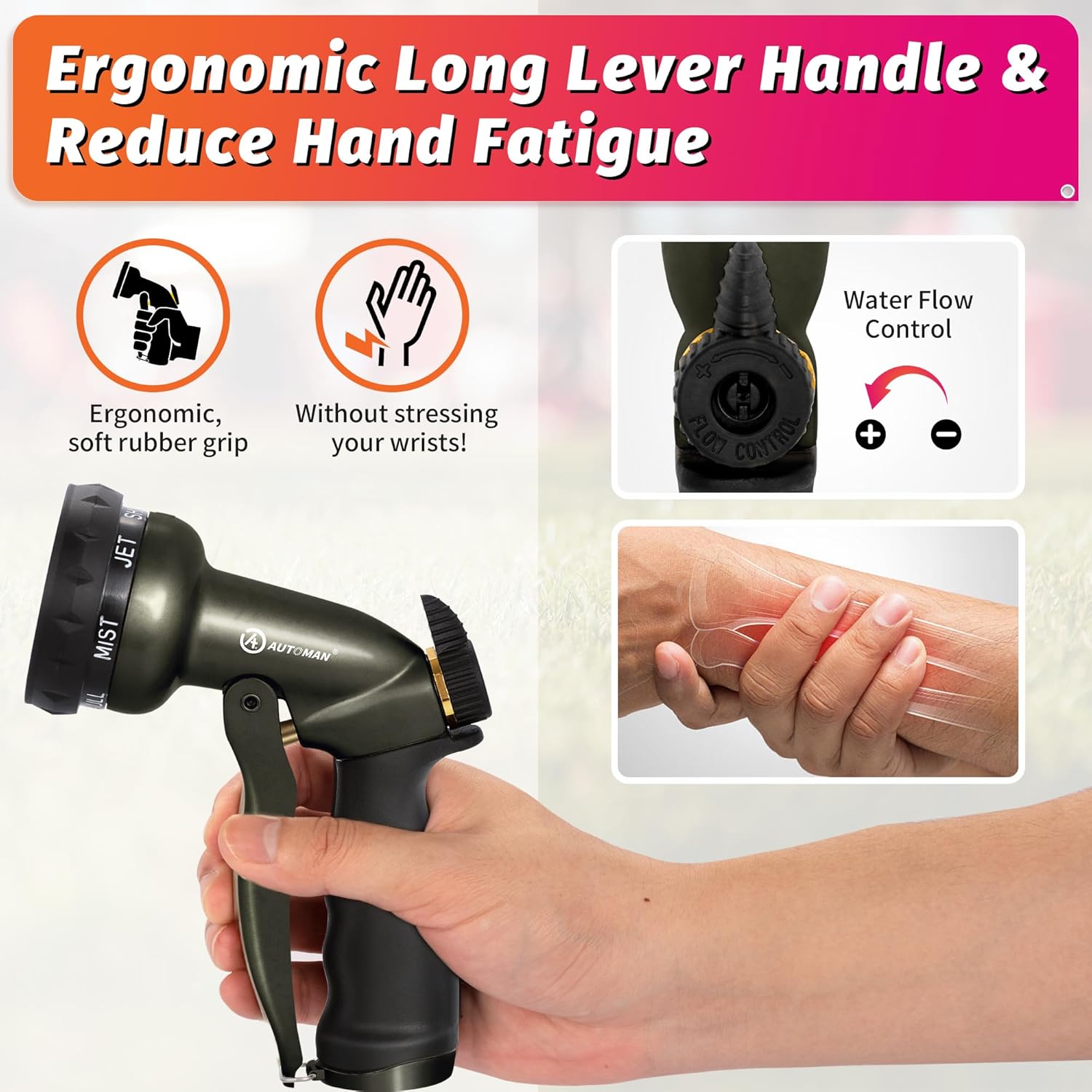 • METAL CONSTRUCTION:The AUTOMAN garden hose nozzle is built using heavy duty metal. It better stands up to impacts and resists corrosion. The shock resistant rubberized bezel dial protects the nozzle from accidental drops. Our garden nozzle is 100% metal and high quality to prevent leaks, rusts and corrosions, much more than the plastic water nozzles.